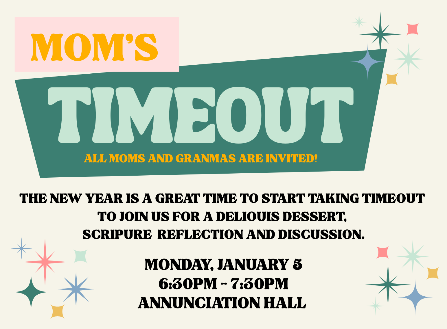 Moms and Grandmas of all ages are invited to spend an hour enjoying a delicious dessert, reflecting on scripture and small group discussion.